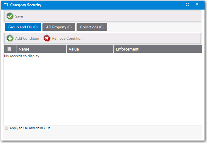 6. Click the Select button to add the condition. After you add a condition to any of the three subtabs (Group and OU, AD Property, or Collections), that condition is listed on that subtab.