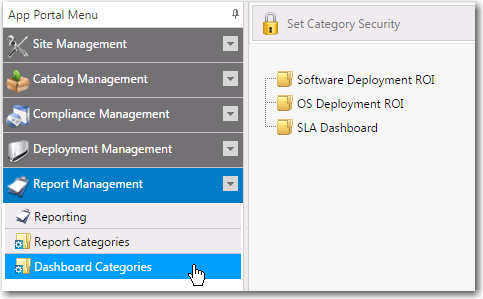 1. On the Admin tab, select Report Management > Dashboard Categories. The Dashboard Categories view opens.