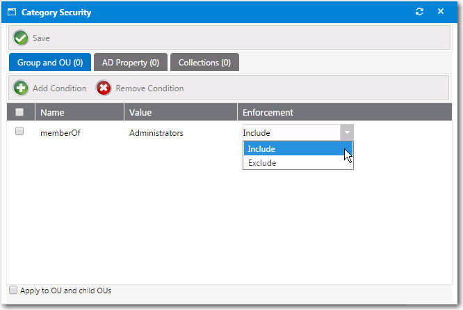 7. After the condition is added, specify the enforcement option you want to take effect by making a selection in the Enforcement column: Include or Exclude.