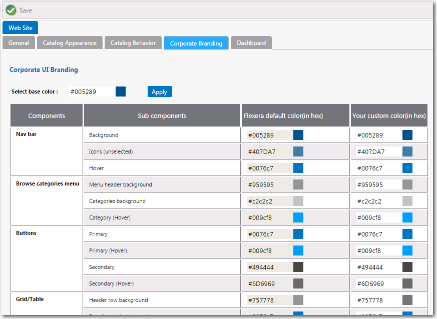 By default, App Portal’s user interface is branded with a color theme that mostly consists of various shades of blue and gray. However, you can change the color theme on the Corporate Branding tab of the Site Management > Settings > Web Site view.