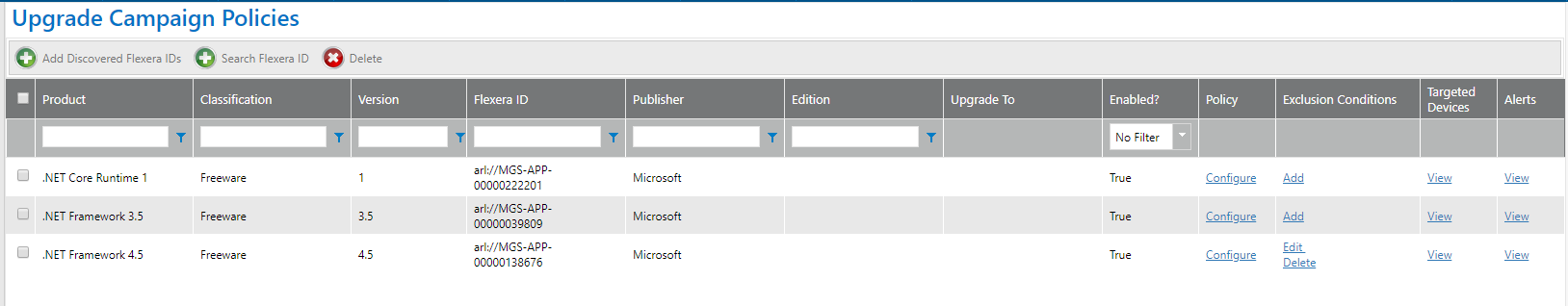 To upgrade an application installed in your enterprise—To create a campaign to upgrade an application that is installed in your enterprise, click Add Discovered Flexera IDs. The Add FlexeraID From Applications Discovered in FNMS view opens, listing all of the applications that have been discovered by FlexNet Manager Suite as being installed in your enterprise. |