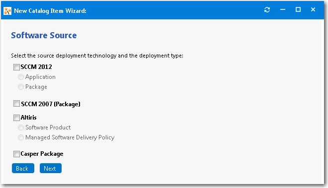 Important:While the instructions in this section assume you are adding a single package or application from ConfigMgr / SCCM 2012 to a new Software catalog item, you can include software from multiple deployment technologies to the same Software catalog item by selecting more than one source on the Software Source panel of the New Catalog Item Wizard.