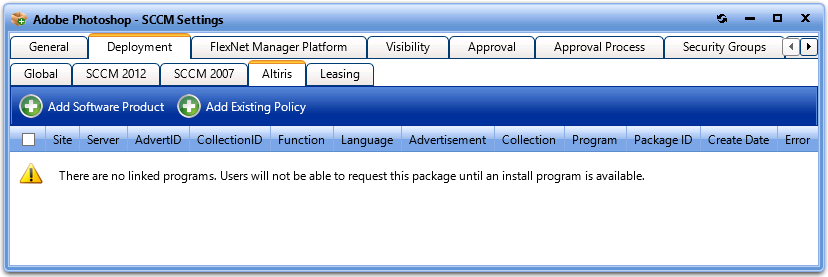 f. Click Add Program. The policy is now listed on the Deployment > Altiris tab.