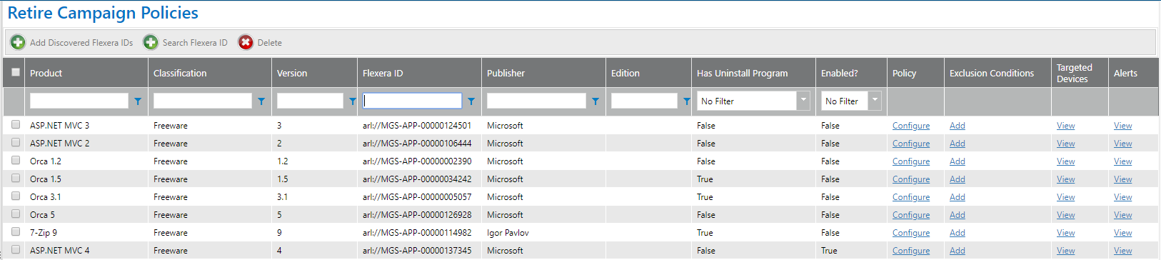 Click to create a campaign to retire an application that could be installed in your enterprise in the future. The Search for Flexera ID view opens, listing listing all of the existing applications/versions in the FlexNet Manager Suite database. |