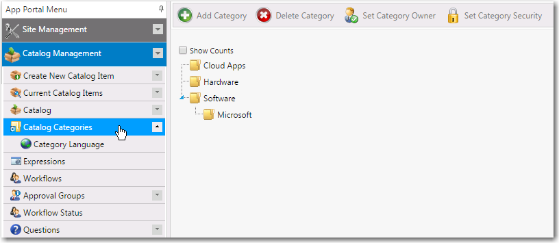 Select Catalog Management > Catalog Categories. Existing categories are listed in the right pane. |