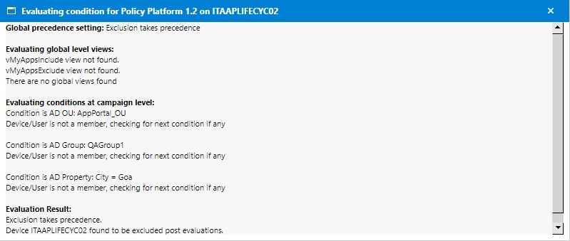 • | The Is eligible for Alerts? column provides a link with Yes/No values and indicates whether the device is eligible for processing the alerts or not based on the conditions defined for that campaign. Clicking this link opens an Evaluating condition for <application name> on <device> pop-up with detailed information on eligibility as shown following: |