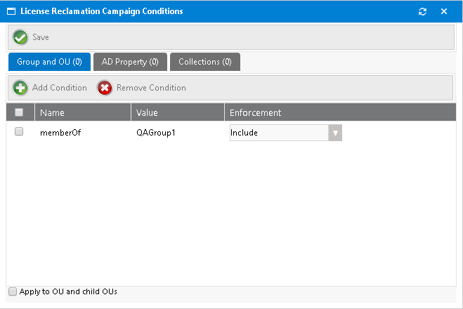If you click Add Condition on the Group and OU, AD Property, or Collections subtabs of the License Reclamation Campaign Conditions dialog box the Add Condition dialog box opens. For more information see Add Condition Dialog Box. |