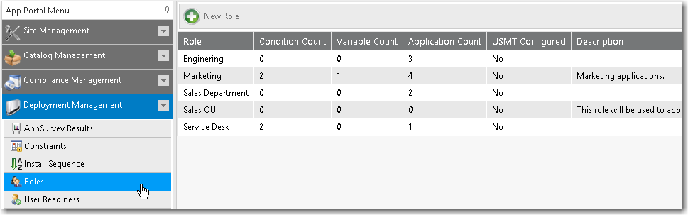 On the Roles view, which is opened by selecting Deployment Management > Roles, all roles that have been created are listed.