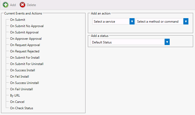 The On Check Status event exists specifically for use in ITSM integration. If this event is associated with an action, App Portal will periodically monitor the ITSM system for a particular status. The moment that App Portal detects that the selected status has been reached, an additional action can be taken. For example, if a status of Approved is reached in a ServiceNow incident, App Portal could then trigger the deployment of the software.