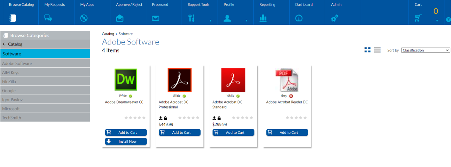 Note:A catalog item can have only single classification. In the above image, Adobe Dreamweaver CC is classified as White which is a Preferred type. Adobe Acrobat Reader DC is classified as Grey which is Non-Preferred type.