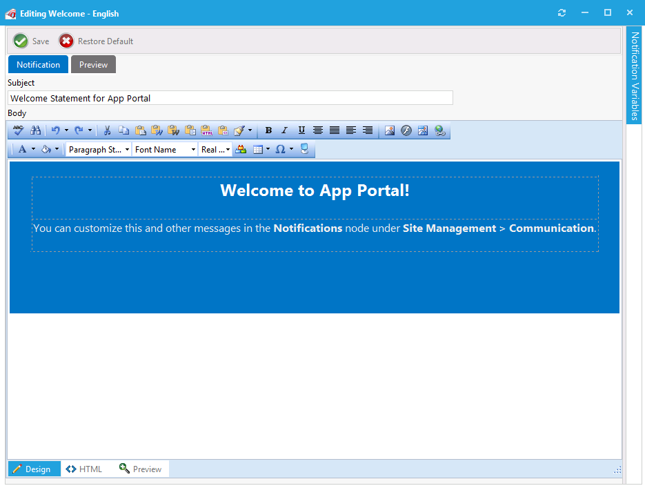 | 2. | Under Site Management, select Communication > Notifications. The Notifications View opens. |