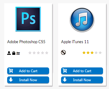 For each catalog item, a product icon is displayed along with the product title, star rating, informational icons, an Add to Cart button and, possibly, an Install Now button.