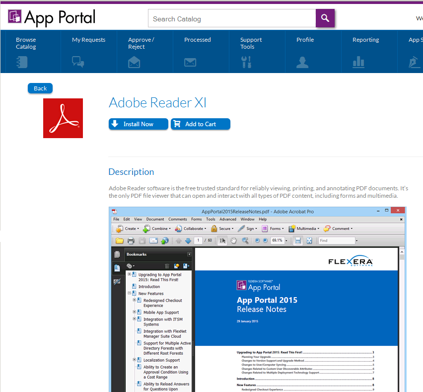 As in the card view, you click Add to Cart to add a catalog item or multiple catalog items to the cart, or you can click Install Now to bypass the checkout experience when requesting a single catalog item.