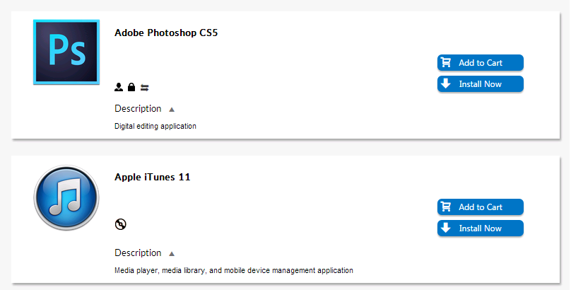 In addition to the product icon, product title, star rating, informational icons, and Add to Cart / Install Now buttons, the list view also includes a description of the catalog item, if one exists. You can click the arrow button next to the word Description to toggle between viewing and hiding the description.