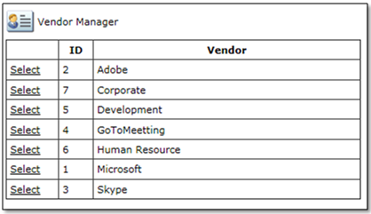On the Admin tab, select Purchase Management > Vendors > Manage Vendors. A list of vendors is displayed.