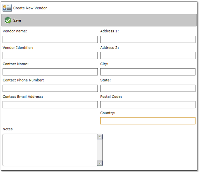 On the Admin tab, select Purchase Management > Vendors > New Vendor. The Create New Vendor form opens. |