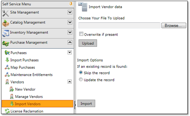 On the Admin tab, select Purchase Management > Vendors > Import Vendors. |