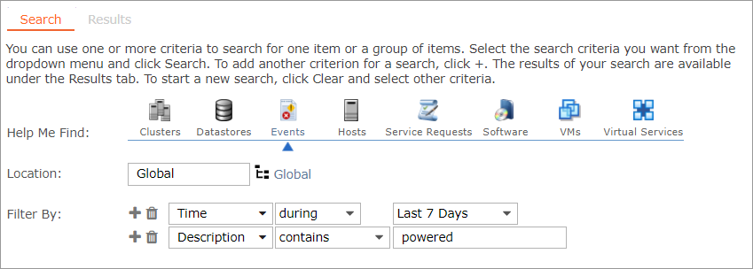 Commander has the ability to create a full audit trail for all change and configuration management tracking. All changes to the underlying public and private cloud resources under management are stored, including the type of change, the date/time, and the user who initiated the change. You can use the complete filter set to search for events related to change and configuration management. For more information, see Search Cloud Data. These searches can be saved and scheduled. For more information, see Run and Schedule Saved Searches.