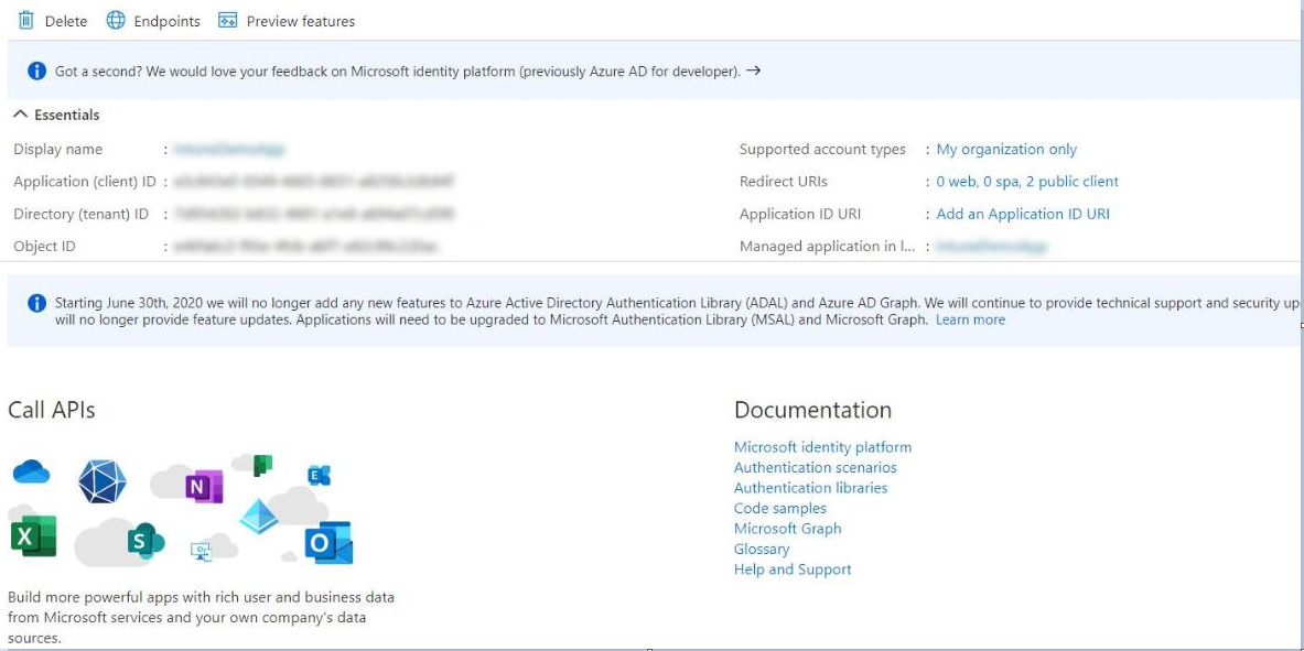 | 7. | Click on the registered account to get Intune connection details like Application (client) ID and the Directory (tenant) ID, which will be used later for authentication purposes. |