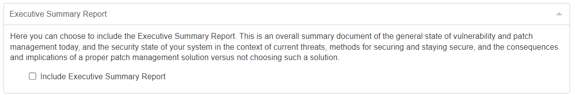 | 3. | Choose to include the Executive Summary Report which provides an overall summary with the general state of vulnerability and patch management. |