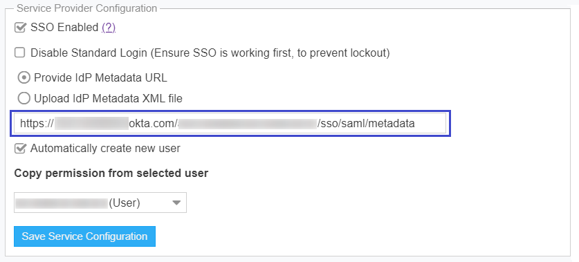 | 9. | Copy the Identity Provider metadata URL from Okta, login into the partition admin, browse Configuration >Settings > Service Provider Configuration, and then check SSO Enabled. Select Provide IdP Metadata URL and paste the copied IdP metadata URL into the text box. |