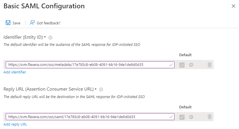 Copy the following from the Software Vulnerability Manager Configuration > Settings fields and paste in the Azure Single sign on > Set up Single Sign-On with SAML > Basic SAML Configuration: |