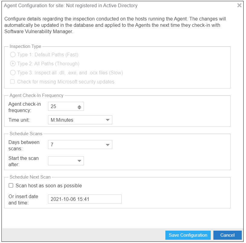 The scan configuration settings set on the Software Vulnerability Manager website are not automatically transmitted to the agents. The agents have to connect to the Software Vulnerability Manager website as per their prior scheduled Agent Check-In Frequency before the agents become aware of the new scan configuration edits. |