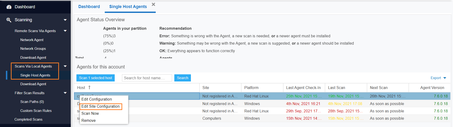 Any edits made to the Agent Check-In Frequency option or selecting the Schedule Next Scan option Scan host as soon as possible will come into effect only after an agent has checked in as per the previously set scan frequency. |