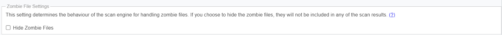 Zombie files are files that were left behind after removing or applying a product/patch. Software Vulnerability Manager will pick up these files since these are listed in Software Vulnerability Manager file signature as being related to an Insecure or End-Of-Life product. Select the Hide Zombie Files check box to ensure that zombie files will not be included in any of the scan results. With the Hide Zombie Files setting enabled, only the highest version of the discovered product will be displayed in the scan results. To activate the Hide Zombie Files setting, a new scan is needed to change the scan results.