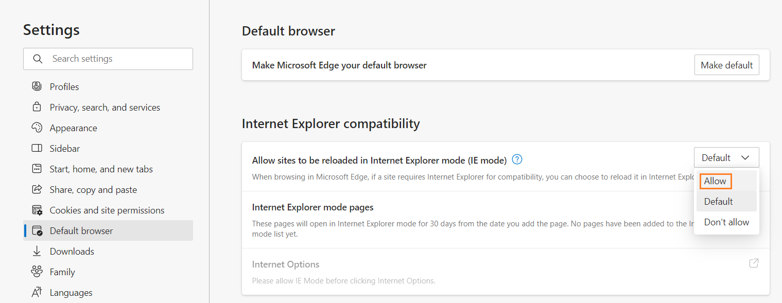 In the Default browser page, slide the Allow sites to be reloaded in Internet Explorer mode (IE mode) toggle to Allow. |