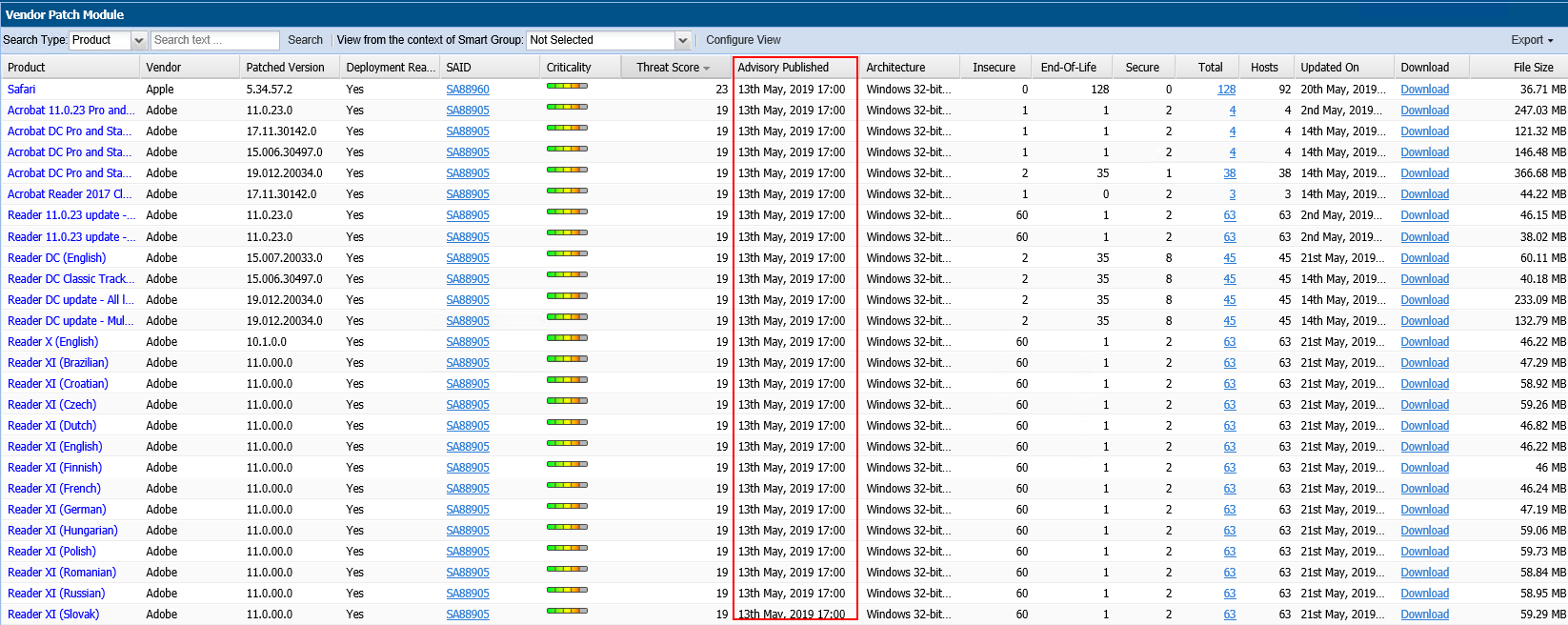 The Advisory Published date is listed in the Vendor Patch Module provides a quick reference for the latest patching information.