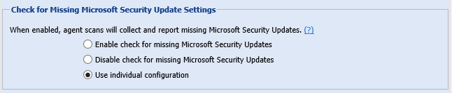 | • | Use individual configuration – Agents will use their site settings or their individual settings for determining whether to check for missing Microsoft updates. If their individual or site setting says that the agent should check for missing Microsoft updates, then that agent will do the check, using the Windows Update Settings. |