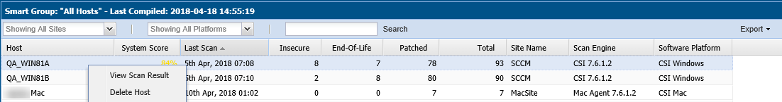 Use this page to view the information for each Host Smart Group you created. Right-click an item in the grid to view the scan result or delete the selected host.