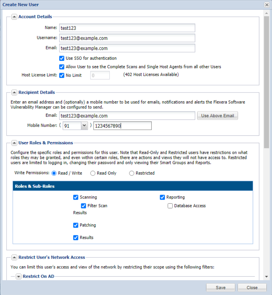 Note:Restrict User’s Network Access options are not available when a Database Access Role is granted.