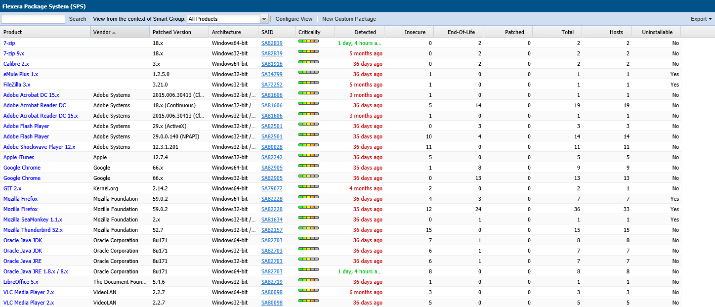 The Flexera Package System (SPS) page displays a list of products for which Software Vulnerability Manager can automatically create an Update/Uninstall package. Right-click any of the listed products to view the available options.