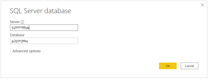 In the Data source settings, select Data sources in current file by clicking on the radio button, and click the Change Sources button. The SQL Server database dialog box appears. |