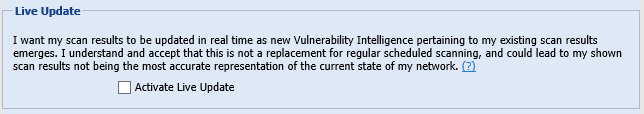 Select the Activate Live Update check box to update your scan results as new Vulnerability Intelligence pertaining to your existing scan results emerges. By doing this you agree that you understand and accept that this is not a replacement for regular scheduled scanning, and could lead to your shown scan results not being the most accurate representation of the current state of your network. Live Update changes will only modify scan data received after enabling this feature. Older scan results will not be affected by this feature. Please note that Live Update does not update Red Hat Agent scan results.