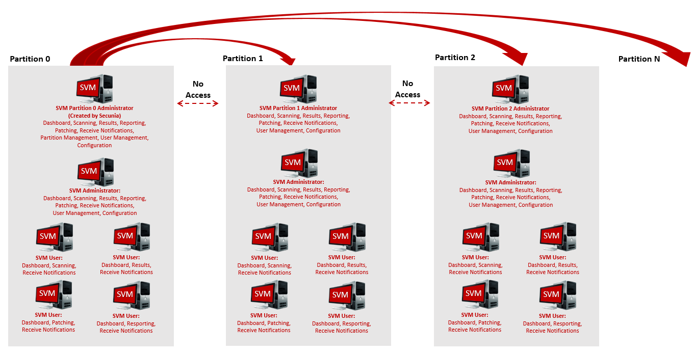 When Flexera creates the Software Vulnerability Manager base user, this user is the Partition Administrator of “Partition 0”. The Partition 0 Administrator is the unique global administrator for the company, irrespective of how many partitions are created.