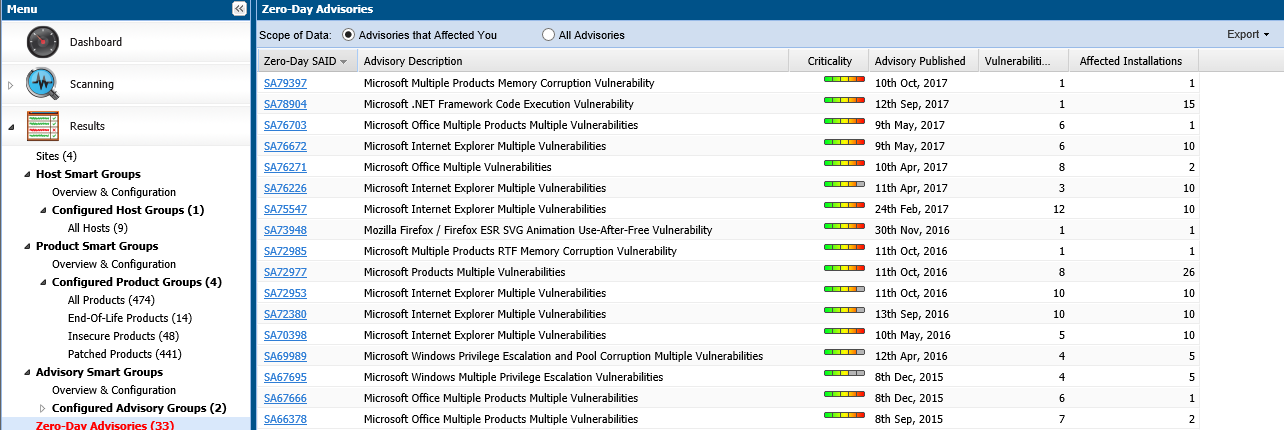 Zero-Day Advisories reference a vulnerability that is actively exploited prior to its disclosure. These advisories can be filtered by Advisories that Affected You and All Advisories.