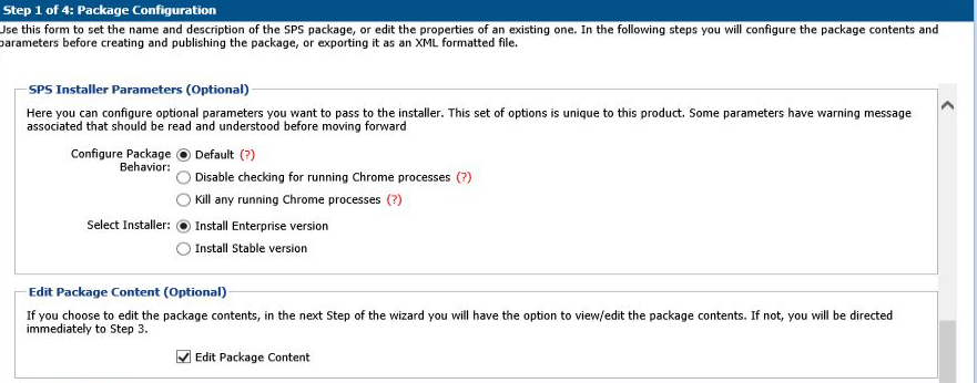 | 2. | In Step 1 of 4 of the SPS wizard (Package Configuration), select the appropriate SPS Installer Parameters and choose whether you want to edit the package contents. Click Next when done. |