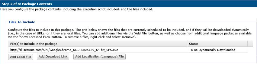 | • | Confirm the updated patched version file appears under Files to Include in Step 2 of 4 of the Flexera SPS wizard and click Next. |