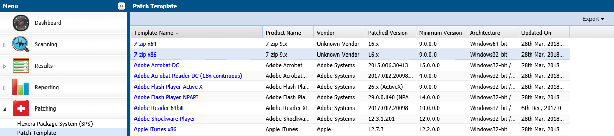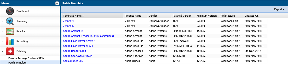 The Software Vulnerability Manager Patching tab includes a Patch Template feature so that users can save a template of their patches for a product. With the Patch Template feature, the user can prepopulate Flexera’s Software Package System (SPS) four-step deployment process and publish directly to WSUS using previously selected options.