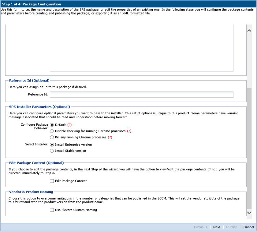 | 2. | Step 1 of 4 of the Flexera SPS wizard will open with the SPS parameters prefilled. From the same SPS wizard, you can either publish the package to various channels or you can save only the template. |