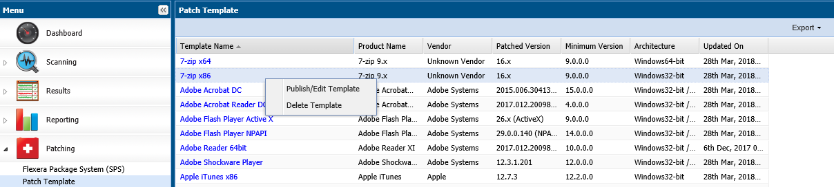 | 1. | From the Patching > Patch Template tab, select the template to be published to WSUS. Right click and select Publish/Edit Template from the context menu. |