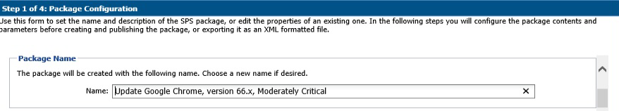 | 2. | When Step 1 of 4 of the SPS wizard (Package Configuration) appears, update the Package Name to indicate this package is for WSUS publishing and click Next. |