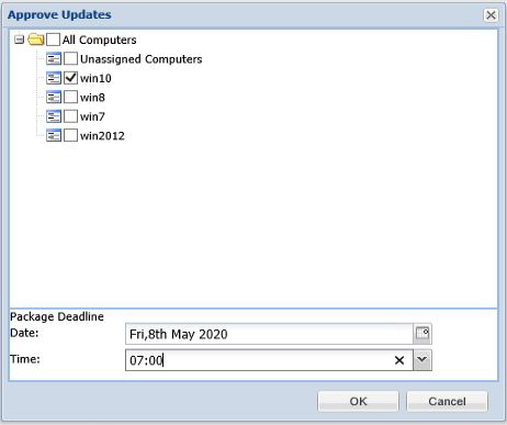 | 6. | When the Approve Updates pop-up window appears, select the appropriate computers to deploy the WSUS package to, select the appropriate date and time to deploy the WSUS package, and click OK. |