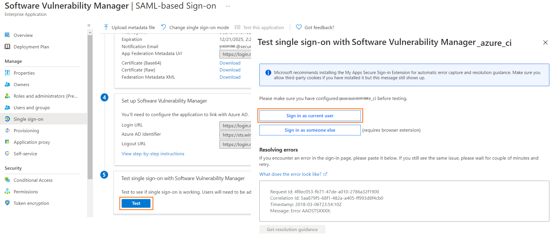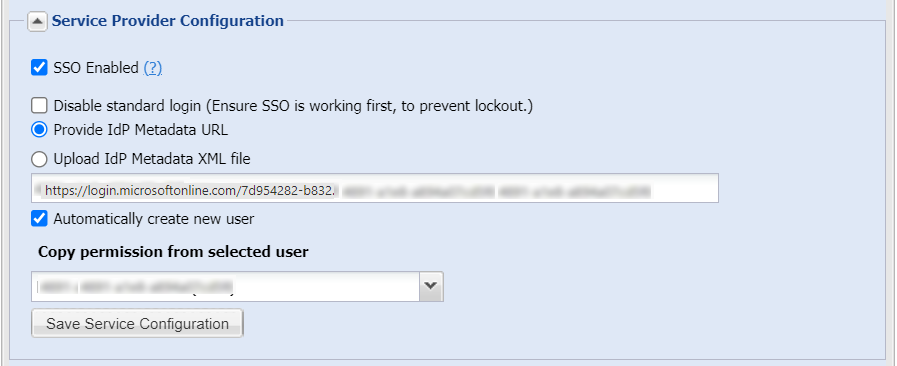 The Set up Single Sign-On with SAML page appears. Under SAML Signing Certificate field copy Metadata Url, login to Software Vulnerability Manager, browse Configuration > Settings > Service Provider Configuration, and then check SSO Enabled. Paste the copied URL into the text box. |