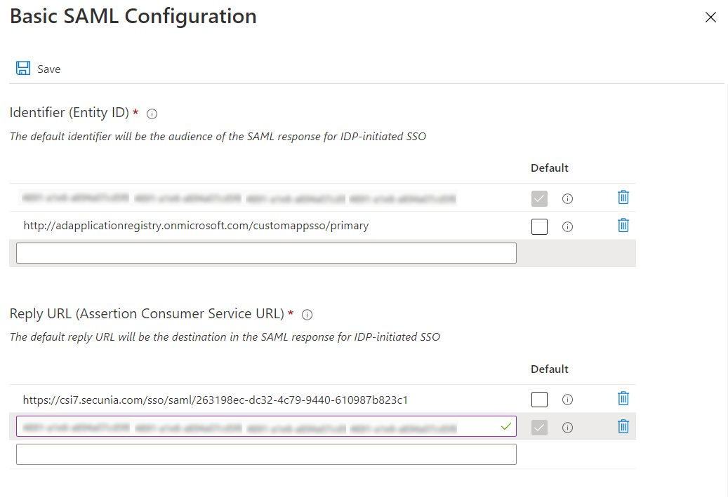 Copy the following from the Software Vulnerability Manager Configuration > Settings fields and paste in the Azure Single sign on > Set up Single Sign-On with SAML > Basic SAML Configuration: |