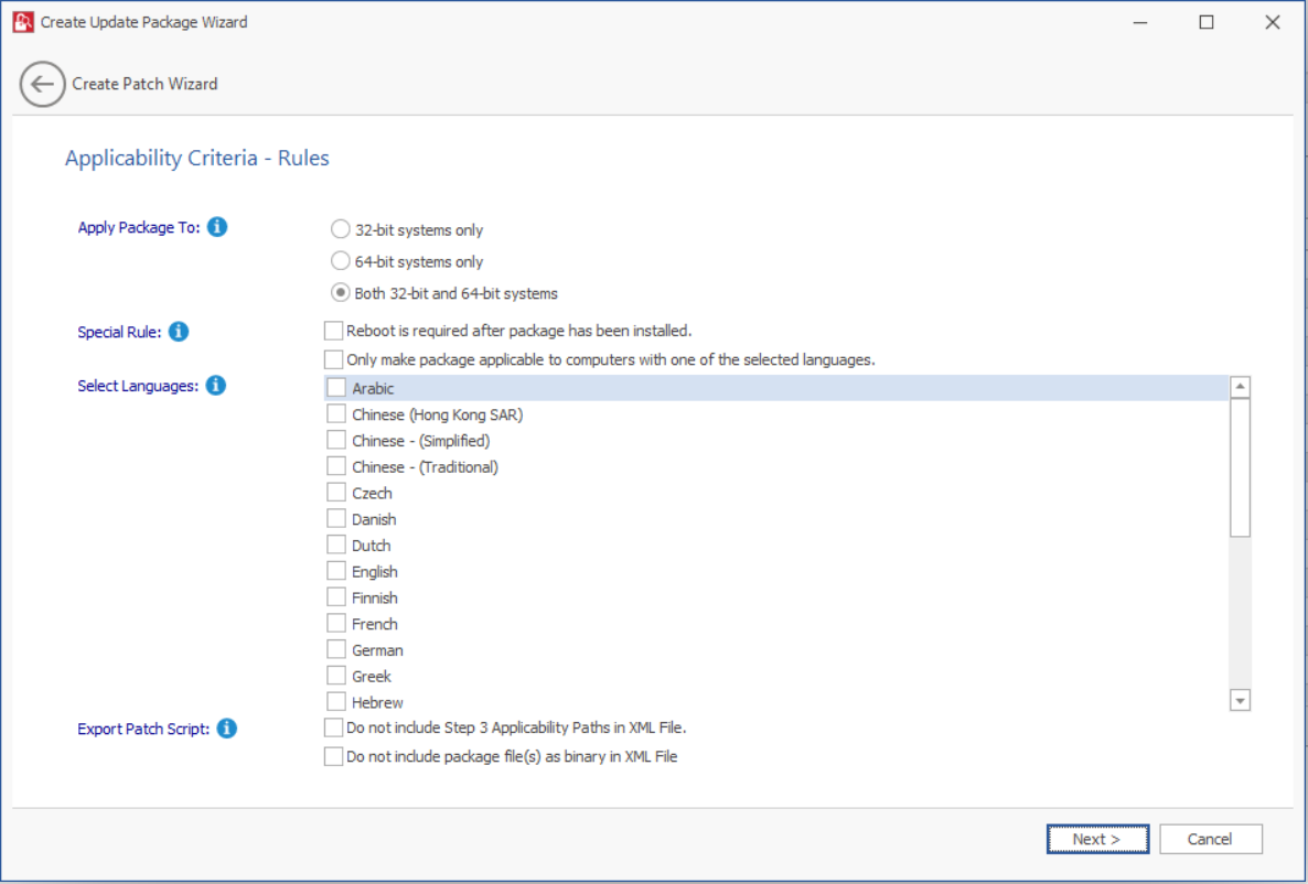 The two options (Do not include Step 3 Applicability Paths in XML File and Do not include the package file(s) as binary in XML File) are taken into consideration only when exporting the package to the File System (Export), otherwise the selection will be disregarded. |