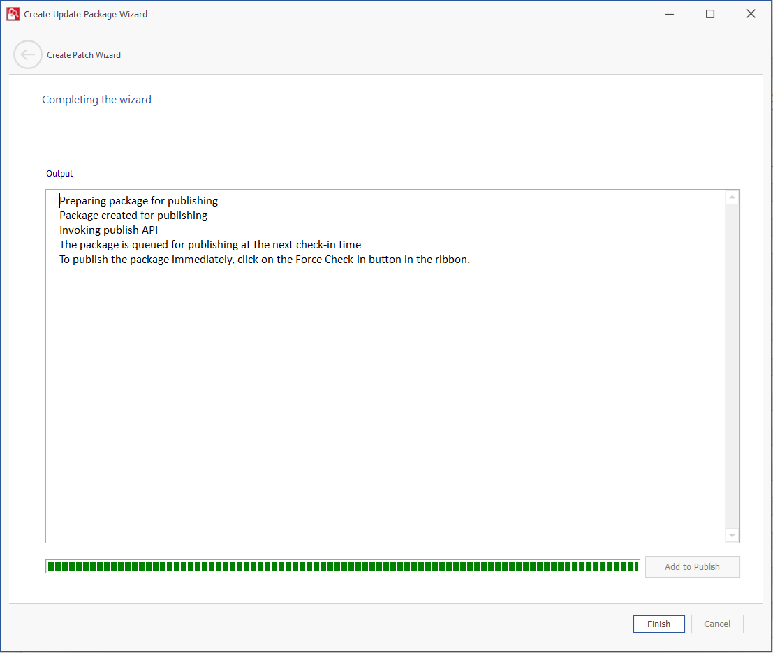 On successful action, package and wizard data will be saved. On Force check-in, the saved package will be published to the specified end point management system.